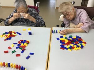 こちらのお母様たちは...あら!ドミノ倒しをしていますね