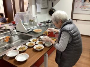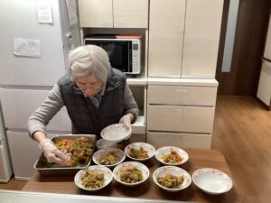 お母さまが食事の盛り付けをお手伝い