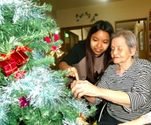 「クリームと果物あったかい」や「あら、キラキラ沢山🤭光物綺麗よね~🎵」と賑やかな会話と共にどんどんケーキとツリーも華やかになっていきます✨