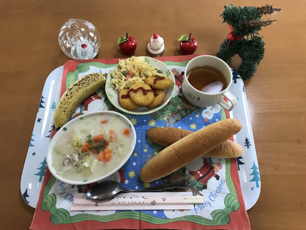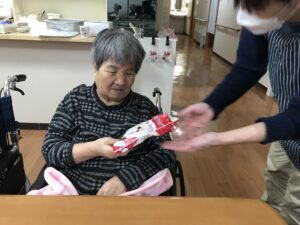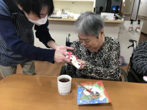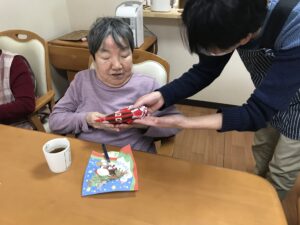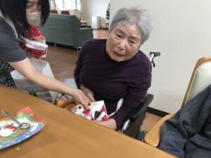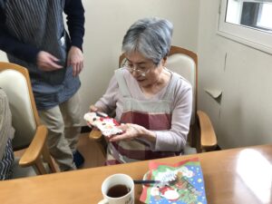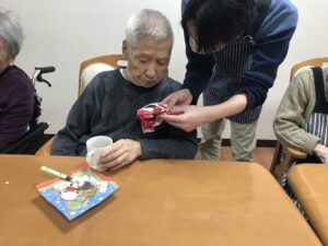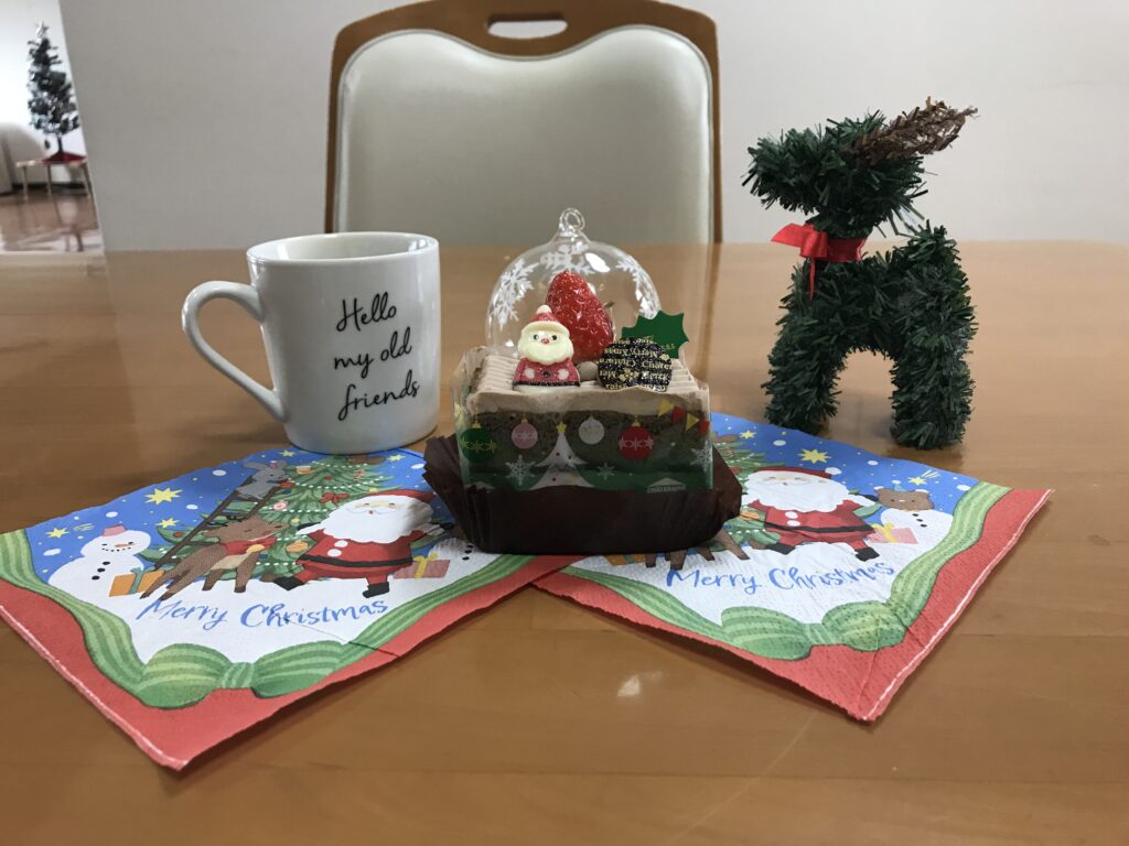 おやつは可愛いケーキです。サンタさんが遊びに来ました。 レクリエーションは職員がフルートを演奏してくれました。 皆様感動していました。 来年も楽しいレクや美味しい料理を提供出来るように考えていきたいと思います。