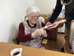 ホームでは写真にあるように普段食べないパン等を召し上がって頂きました。