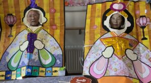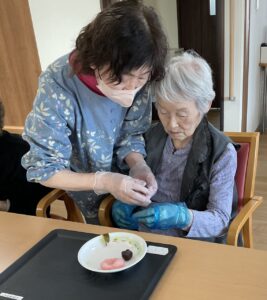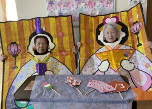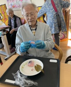 3月は春らしい季節を感じていただけるよう、桜やお雛様の壁面制作を皆様で協力して飾ました🌸またお雛様の顔はめパネルで写真撮影もしています🎎おやつの時間には桜餅づくりもしています☆甘い香りに包まれながら皆さん楽しまれていたようです😊出来上がった桜餅を美味しく召し上がられています☆