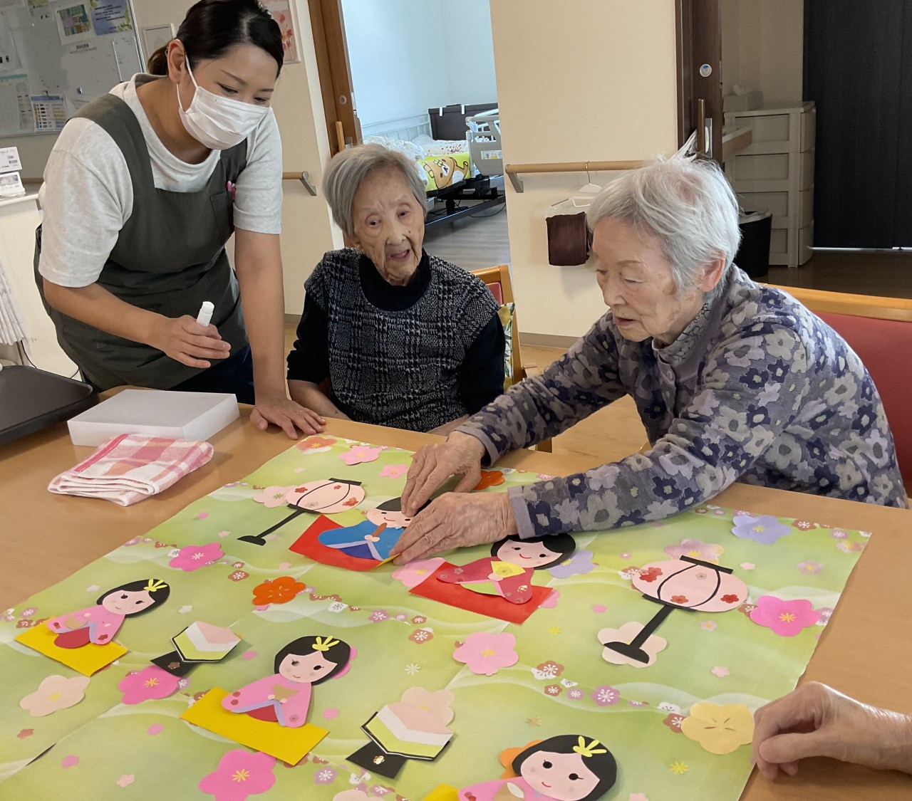 3月は春らしい季節を感じていただけるよう、桜やお雛様の壁面制作を皆様で協力して飾ました🌸またお雛様の顔はめパネルで写真撮影もしています🎎おやつの時間には桜餅づくりもしています☆甘い香りに包まれながら皆さん楽しまれていたようです😊出来上がった桜餅を美味しく召し上がられています☆