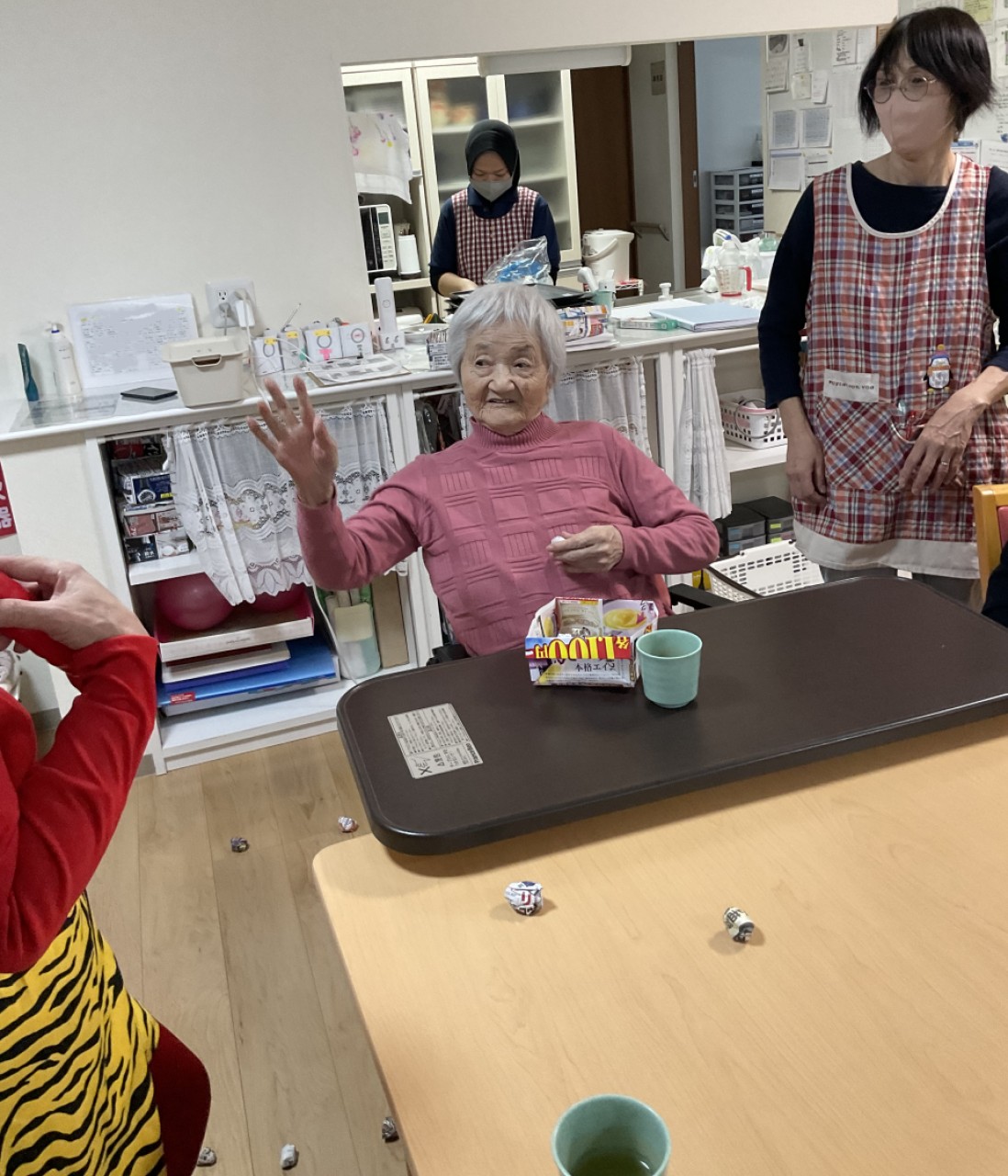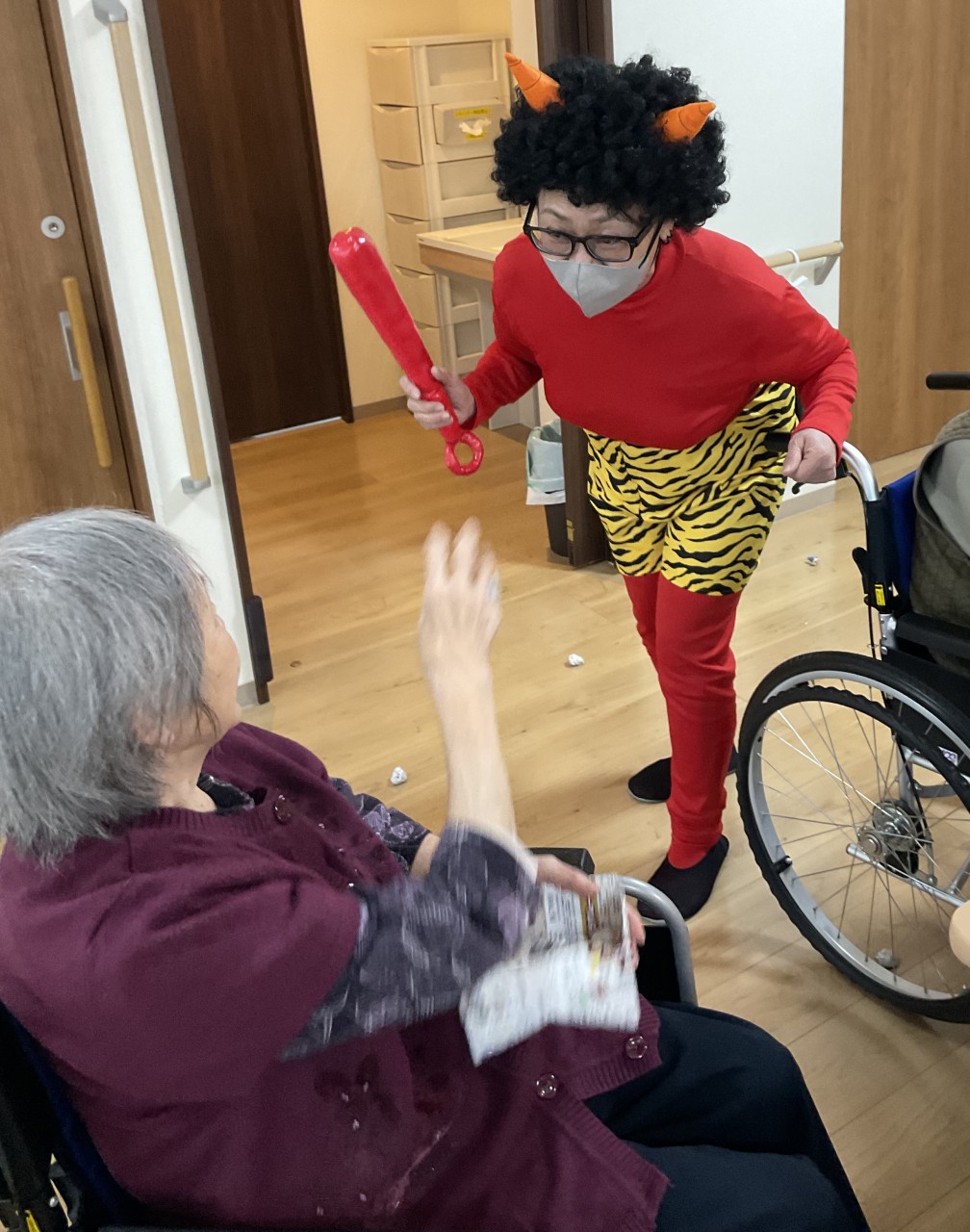 2月の季節行事で豆まきを行いました~赤鬼👹に扮したスタッフ(ホーム長( ´∀` )が登場すると豆の代わりに丸めた新聞玉を投げつけ厄払いを払いをしています☆今年も健康で元気に過ごせるよう願いを込めた楽しい時間となりました😊