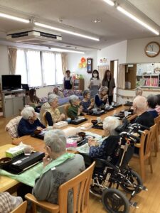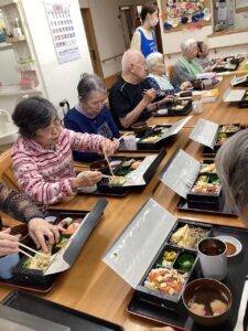 両ユニットの入居者様が集まり、和気あいあいとお寿司ランチの昼食会です。