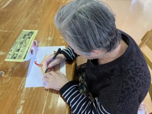 又、書きあがった後は絵馬と一緒に記念撮影をし、フロアの壁に飾りつけをしてお正月気分を楽しんでいただきました。