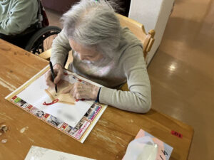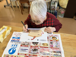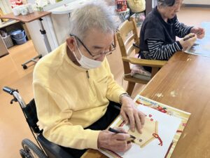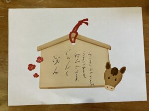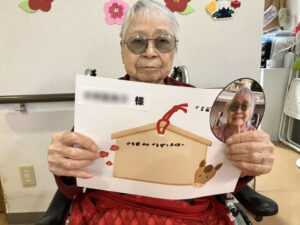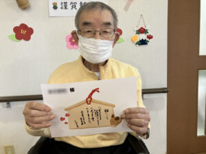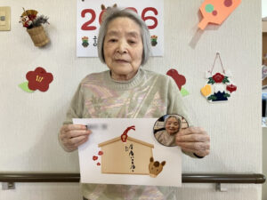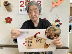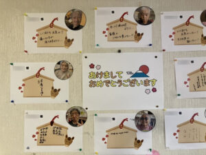 朝里3階では、お正月ということで入居者の方々に絵馬に願い事を書いて頂きました。