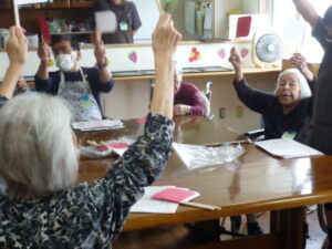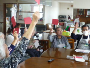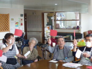 旗上げゲーム 2025/11/12 【ふれあいの里 グループホーム 花みずき】 10月末のご様子です😃 旗挙げゲームをしました⛳ 「赤上げて・白下げないで赤下げる」のゲームです。 皆さん間違えずに掛け声に合わせて旗を上下してくれました~🎵