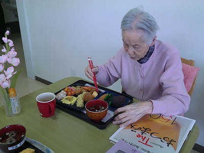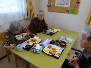 1Fでは、春の食事会メニュー :手作り稲荷寿司、だし巻き卵、カツ、煮物!! おやつにイチゴチョコレートケーキでした~