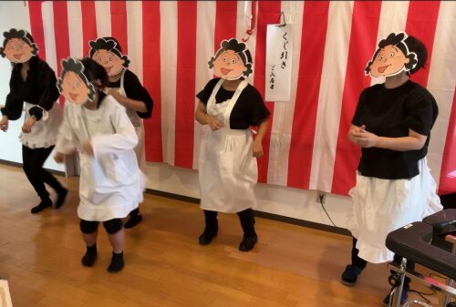手作りのお面をかぶり