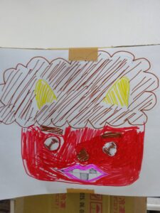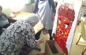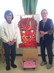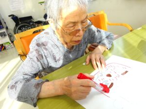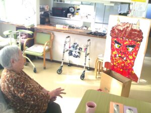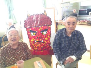豆まきではなく、入居者様が作成した鬼の絵やちぎり絵に、