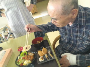 昼食には、特注のいなり・のり巻き寿司とメンチカツ、ポテトサラダ、茶わん蒸しを添えて・・・