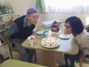 15時の誕生会では、誕生者の方にケーキのローソクの火を消していただき、皆でお祝いしました~