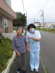 管理者とお散歩🚶♀️🚶♀️途中、どんなの話をしたのでしょう。はちきれんばかりの笑顔が撮れました😆