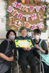 職員の手作りケーキとカードの贈呈、そして入居者様全員でお誕生日の歌を