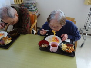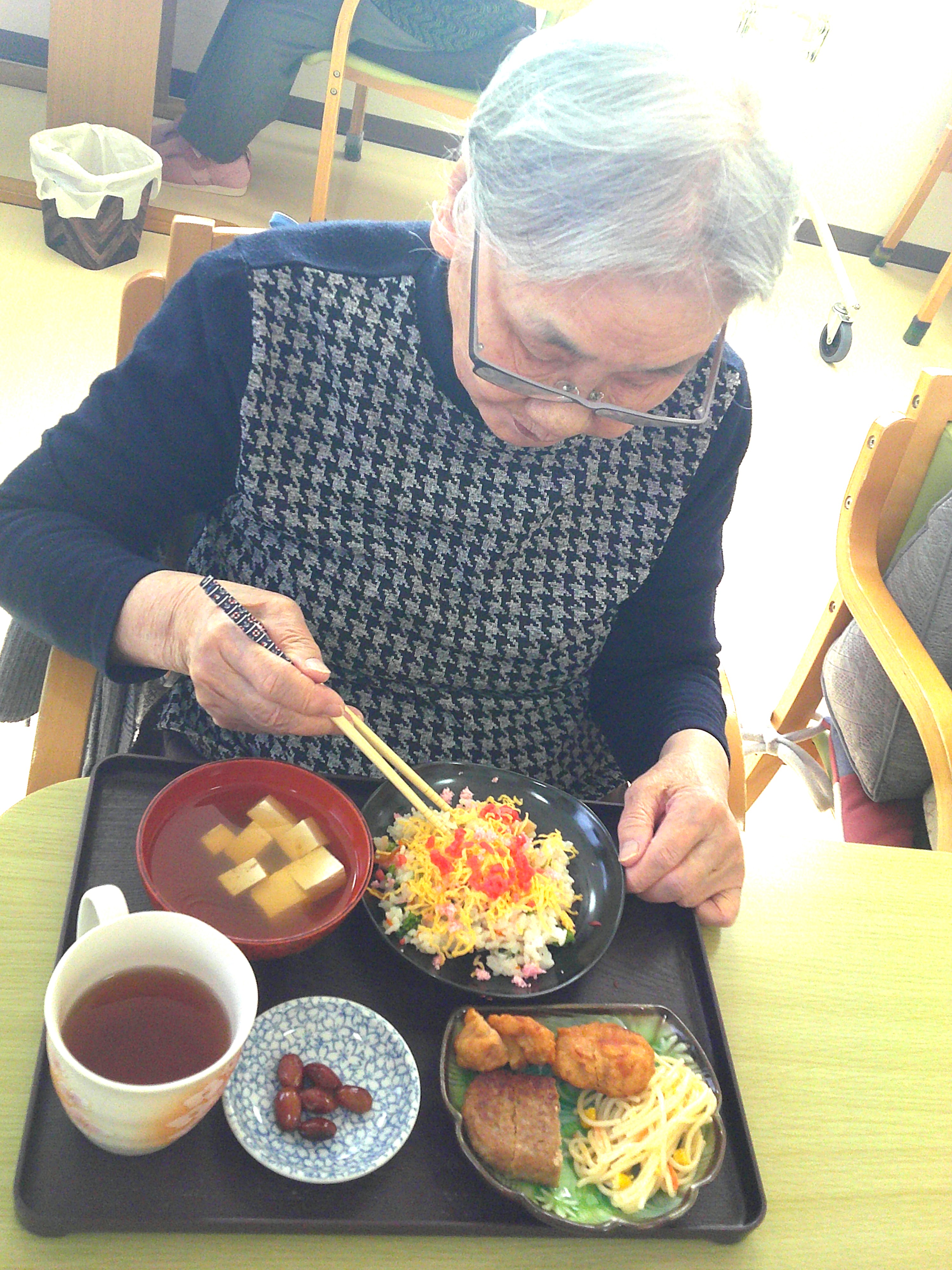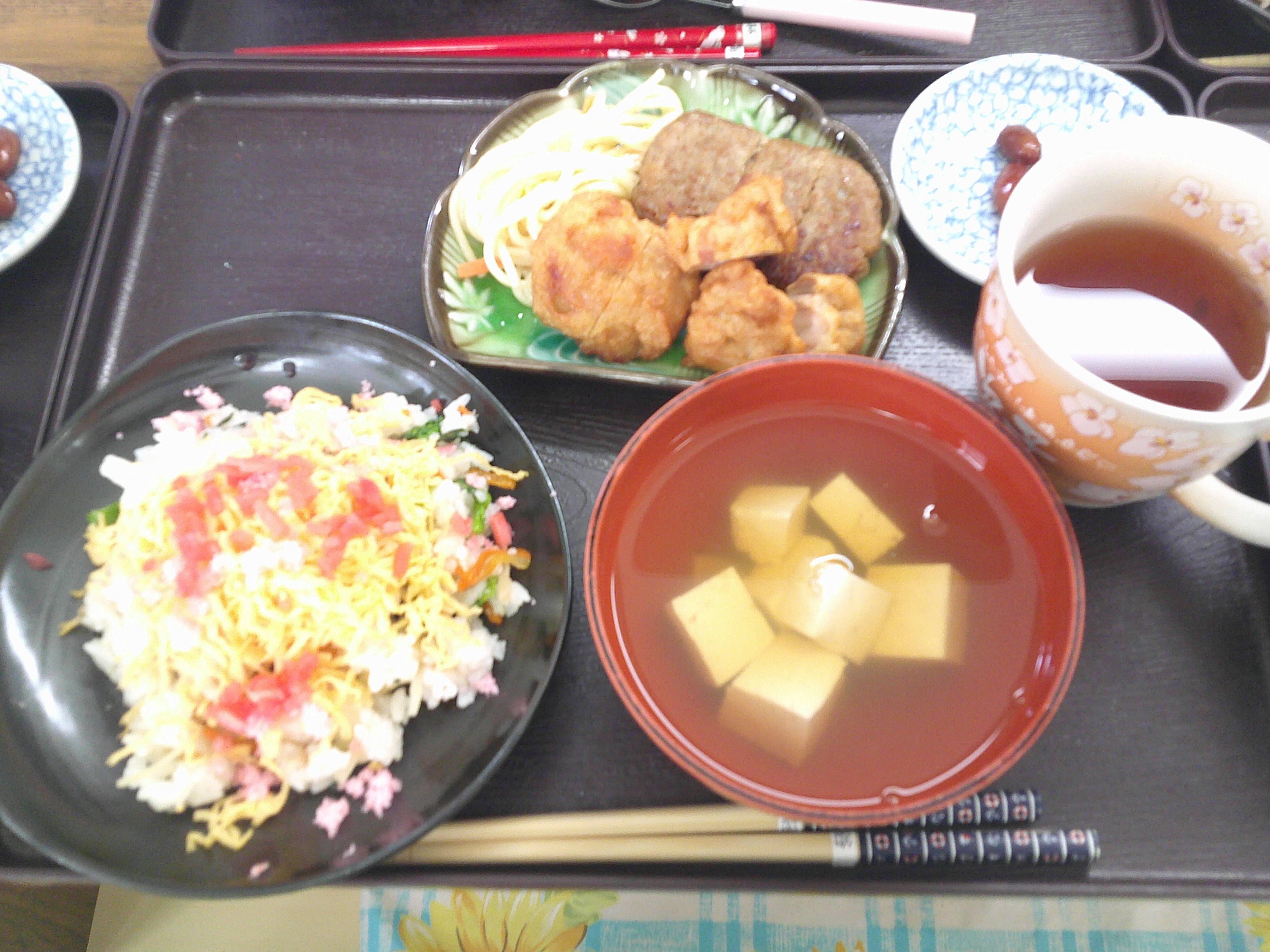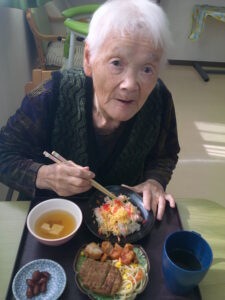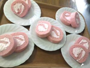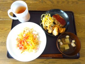 ちらし寿司やハンバーグ、から揚げ、おやつにはイチゴのロールケーキを提供しました。