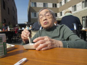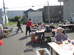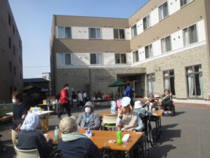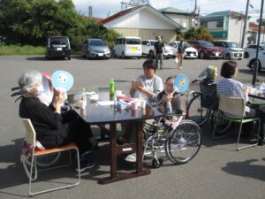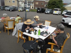 施設の駐車場にてお食事でたこ焼き