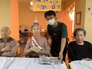 バースデーソングを皆さんで歌いプレゼントをもらいました。