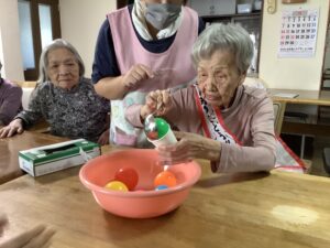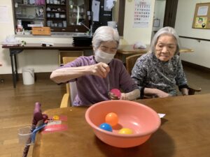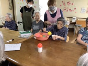 箱の中から1枚選んで同じ色のボールをすくって紙コップの上にのせれるか!!