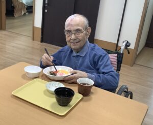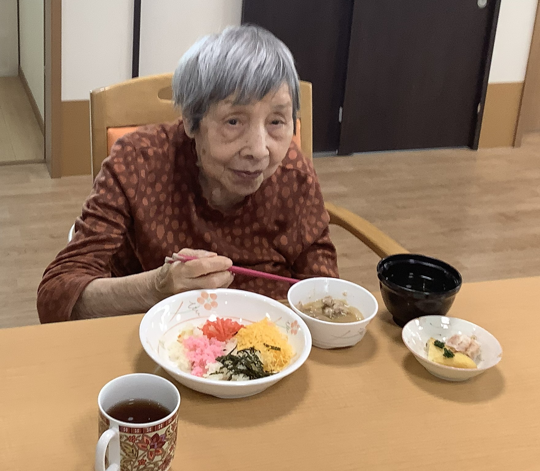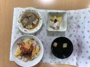 この日の昼食は、彩り綺麗なちらし寿司に煮物とお吸い物。