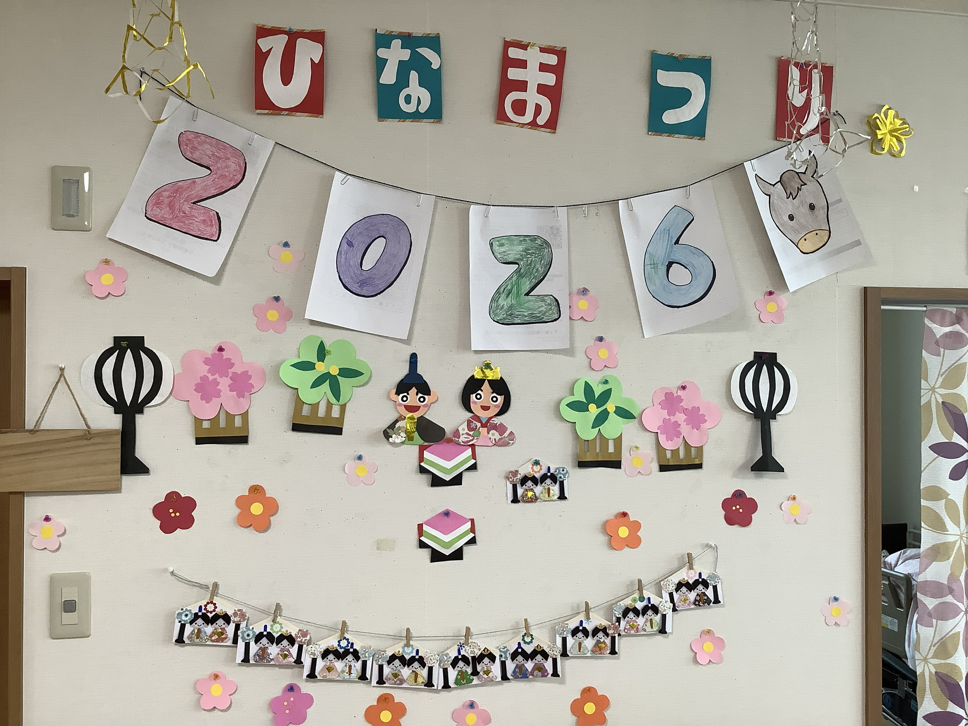 壁には可愛らしいお雛様飾り。