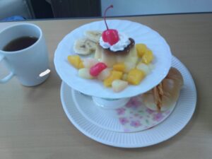 プリンアラモード🍮と、軽食スパゲッティ総菜パン🍞