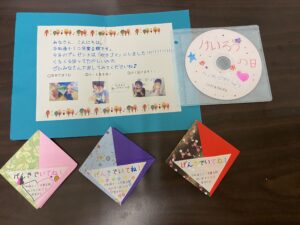 プレゼントは「吹きゴマ」でした。色々な折り紙を使って綺麗に丁寧に作ってありました。1つ1つメッセージも入っています!