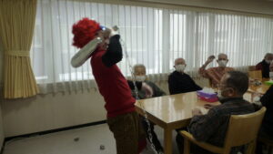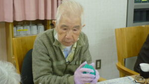 丸めた新聞を豆に見立て