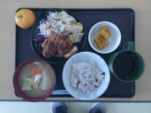 ボリューミーな豪華手作り豚カツと、鮭の入った粕汁、おこわで、入居者様も大満足!!