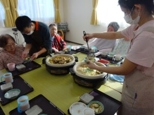 入居者様からも要望のあった、鍋パーティーを行い、すき焼き鍋と塩海鮮鍋の