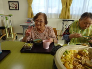 入居者様からも要望のあった、鍋パーティーを行い、すき焼き鍋と塩海鮮鍋の