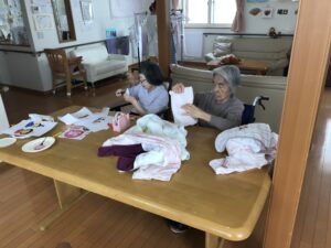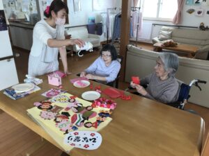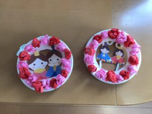 来月はひな祭り!ということでひな祭りの飾りを作っていただきました。上の写真は作成中の様子です。
