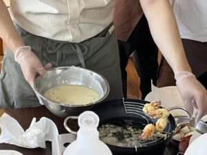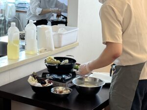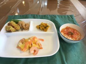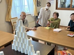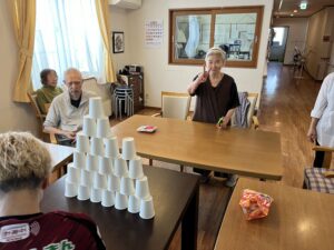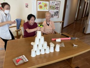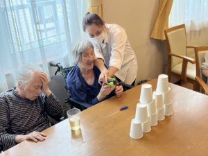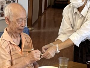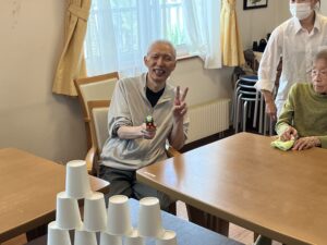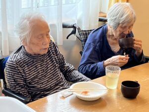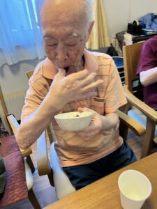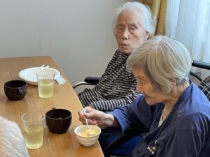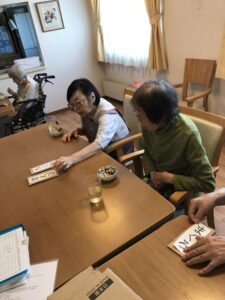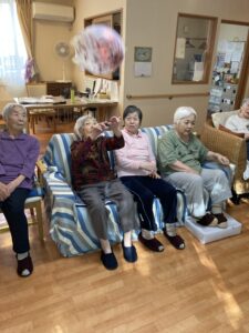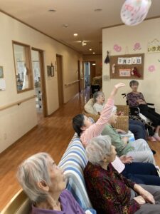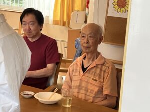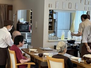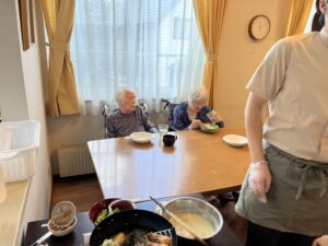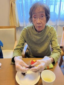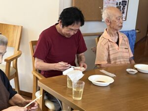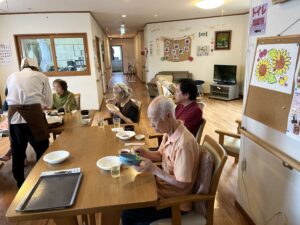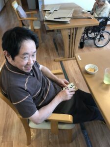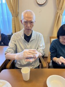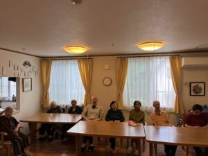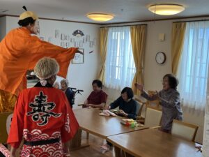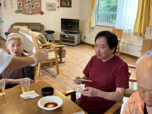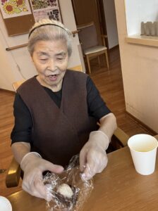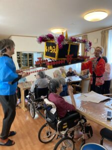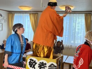敬老会を行いました。職員がお神輿を作り皆でお祝い。昼食は職員が板前に扮し目の前で料理を振る舞いました。レクを行ったりおやつには自分でおはぎを作り食べました。皆さんで楽しいひと時を過ごしました。